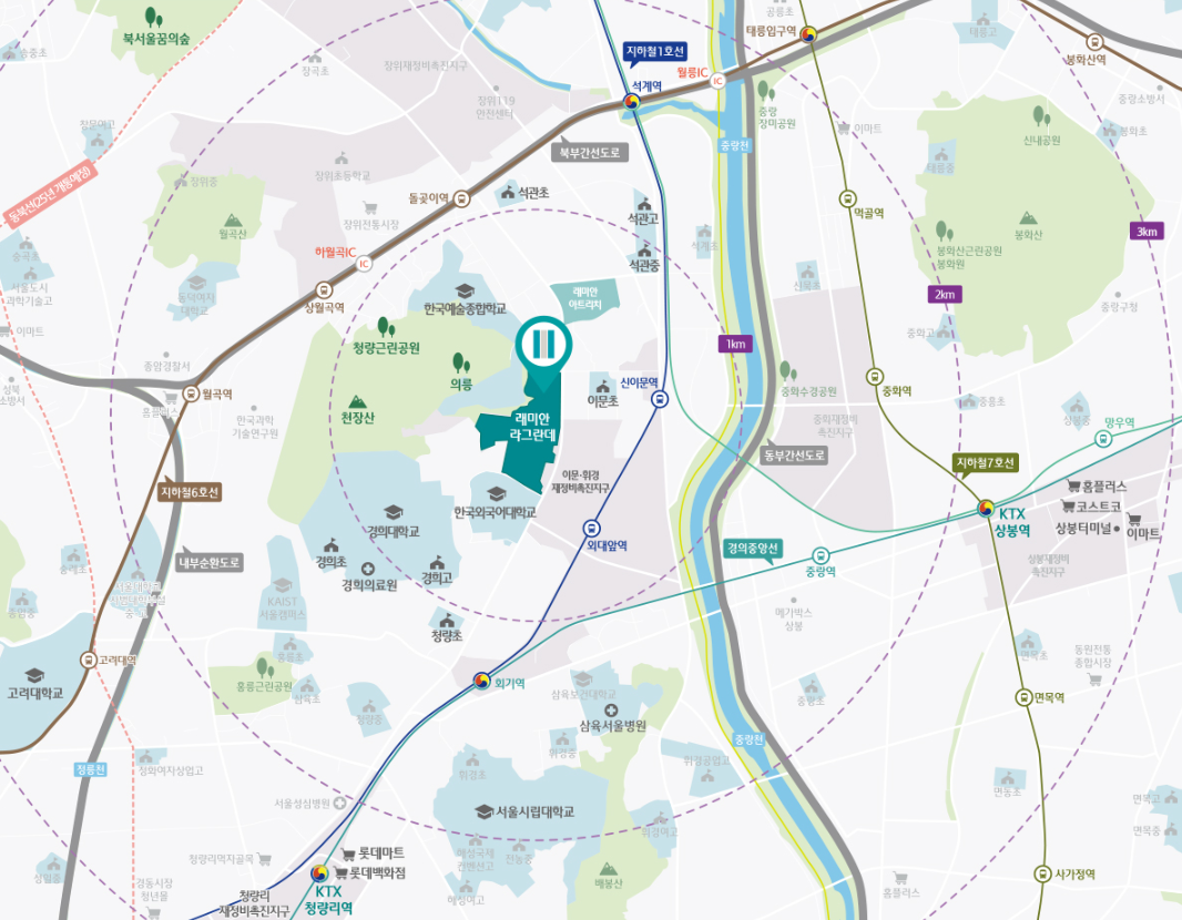 또 이문초, 청량초, 경희초·중·고(사립), 한국외대, 경희대, 한국예술종합학교 등 교육시설이 인접해 있으며, 경희의료원, 삼육서울병원 등 의료시설, 청량리역과 상봉역 주변 대형마트, 백화점, 영화관 등 인프라가 잘 구비되어 있습니다.