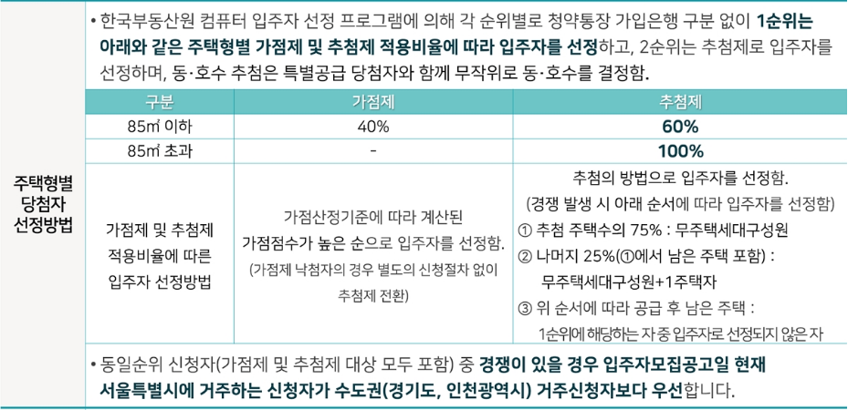 85 제곱미터 이하의 평수는 가점제 40%, 추첨제 60%로 진행되며, 85 제곱미터 초과 평수는 추첨제 100%로 진행됩니다.