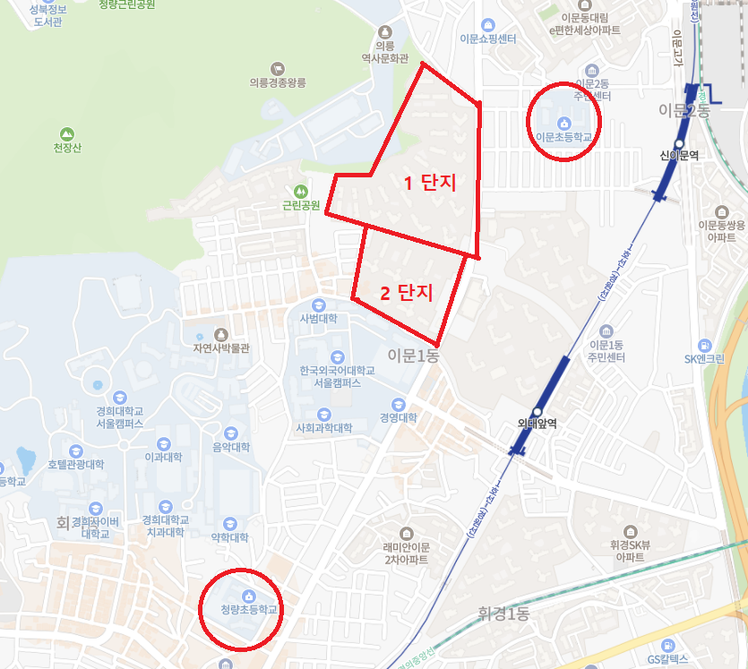 어린 자녀를 둔 분들은 초등학교 배정에 대해 궁금하실 텐데요. 현재 통학구역이 1단지 좌우로 나누어져 있어서 2단지와 1단지 일부는 청량초등학교, 1단지 일부는 이문초등학교로 배정될 것으로 보입니다. 이문초등학교 까지는 도보로 5분, 청량초등학교까지는 도보로 15분이 걸릴 것으로 보이는데, 단지 배정운에 따라 15분 가량 소요되는 청량초등학교에 배치될 수 도 있다는 점은 다소 아쉬운 점이라 할 수 있겠네요.