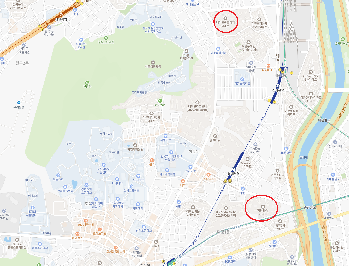 규모가 큰 단지인 만큼 지하철역에서 거리를 보면 이문로에 인접한 동들은 500m 정도 거리에 있고 가장 먼 동은 약 700m 정도 거리까지 차이가 있어 지하철역과 가까운 동인지 먼 동인지에 따라 추후 시세에도 영향이 있을 것으로 예상됩니다.