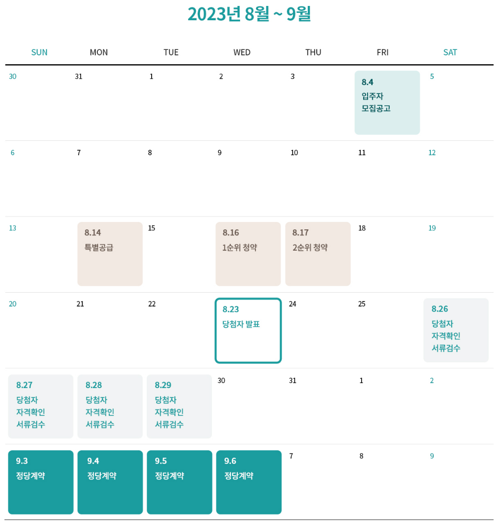 당첨자 발표는 8월 23일(수)이고, 계약일은 9월 3일(일) ~ 9월 6일(수) 까지입니다.