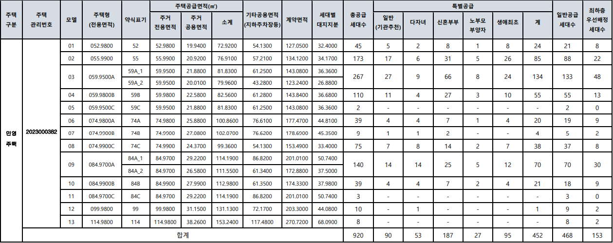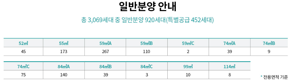 총 3,069세대 중 일반분양 물량 920세대를 분양하는데, 특별 공급은 452세대, 일반 공급은 468세대가 공급됩니다.