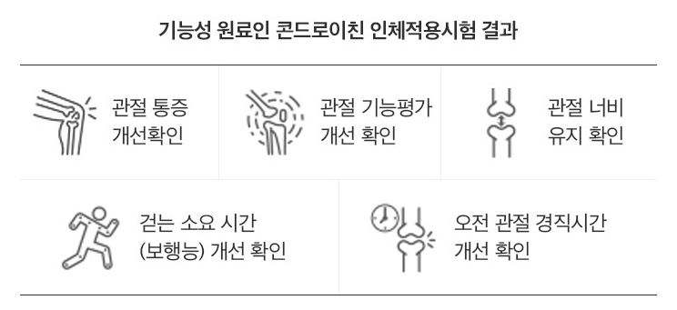 또, 콘드로이틴은 연골 파괴를 예방하거나 감소시키며, 연골 조직의 유연성을 개선시키고, 관절 움직임을 원활하게 하는데 도움이 된다고 합니다.