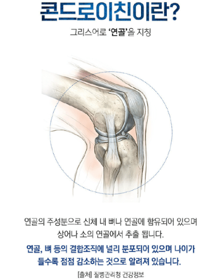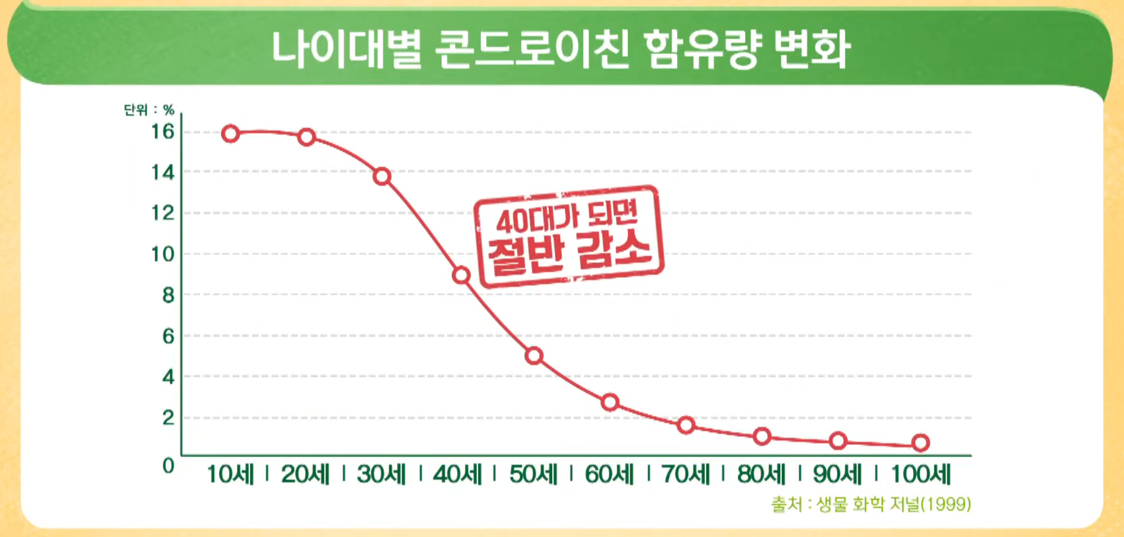 위 표를 보시면, 나이가 들 수록 우리 몸 속의 콘드로이친이 점점 줄어들어, 40대 이상이 되면 몸속의 콘드로이친 양이 절반이 되버림을 알 수 있습니다.