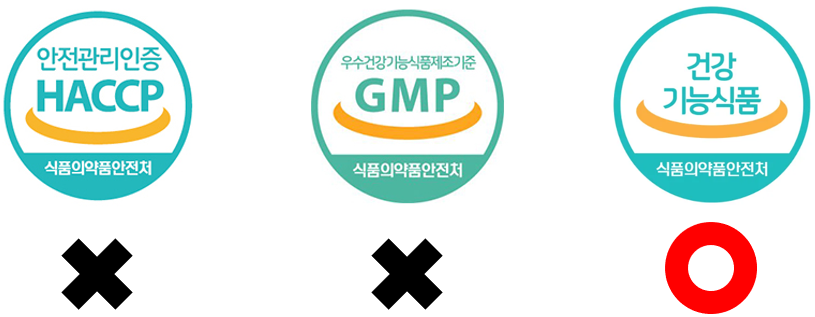 또 한가지 주의하실 점은, 건강기능식품 인증 마크와 유사한 안전관리인증 HACCP 마크나, 우수건강기능식품제조기준 GMP 마크를 붙여서, 마치 건강기능식품 인증을 받은 것 처럼 보이게하는 제품들이 있어요. 아래 사진에서 가장 오른쪽에 있는 마크만이 건강기능식품 인증 마크이고, 왼쪽과 가운데 있는 마크는 건강기능식품 인증 마크가 아님에 주의 하세요!