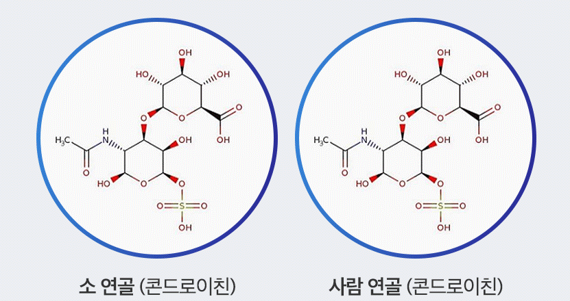 인간의 콘드로이친 구조와 소의 콘드로이친 구조가 동일하여, 소 연골을 원료로 하는 콘드로이친 제품이 체내 흡수가 빠릅니다. 체내 흡수가 빠르고 쉽게 되기에, 소화능력이 떨어지시는 분들께는 소 연골 제품을 추천드리는 것입니다.